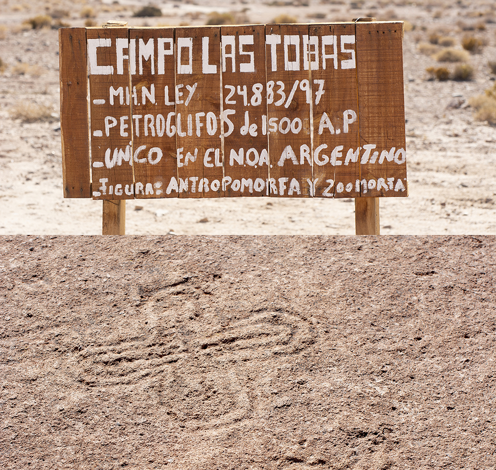 Hello dear readers. In the last article we arrived in the small town of Antofagasta De La Sierra, province of Catamarca. Before we continue on I’d like to mention that the volcano Galán and the laguna Diamante can be reached from a track just north of Antofagasta. Even if you already drove up there from the hamlet of El Peñon as described in the previous post, this track is well worth driving because of the beauty of landscapes along the way, and the views from up there, mostly if you camp along the way. At night you can see the lights of town in the valley below in the distance. That gives you a very powerful perspective of how high you are. Start the road 43 north for a few kilometers then a small track heads east. GaiaGPS map here. The first point of interest is reached shortly after and is signed: Campo De Las Tobas. This is a small but interesting archeological site with pictographs in the rocks in the ground. It is worth taking a few minutes to walk around the site. As always please be respectful and do not step on the pictographs. There are more pictographs in the area but they cannot be found without the help of a local guide. From here already the view to the west, where you came from, is interesting. But we’re just getting started.