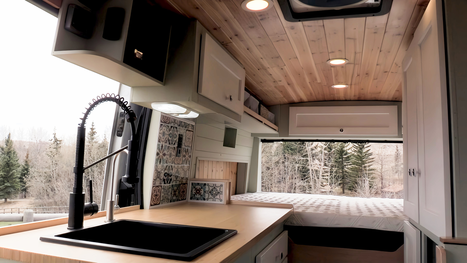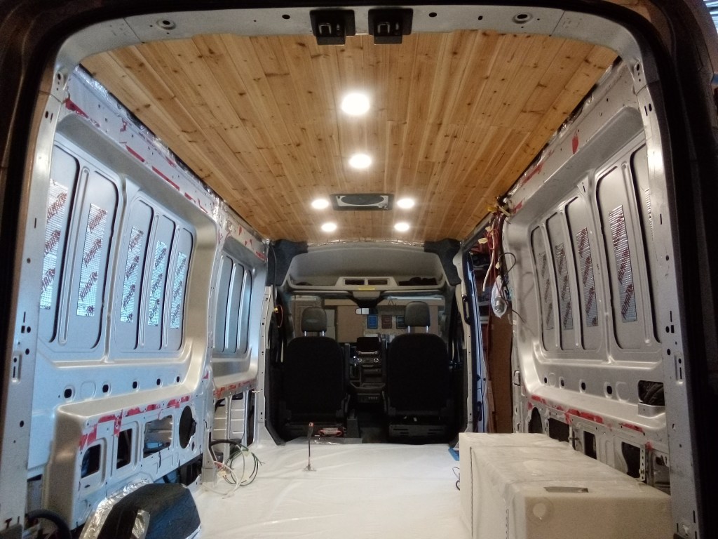 Our Transit came as an empty 148″ wheel base, mid-roof cargo van. Once the conversion is complete it will be operational for all-season full-time living. Our needs are simple so we decided not to have a toilet or shower. But we wanted a permanently installed comfortable bed. We also want a simple but efficient kitchen with a fridge, a portable propane campstove to be able to cook inside or outside, and a sink with running water.